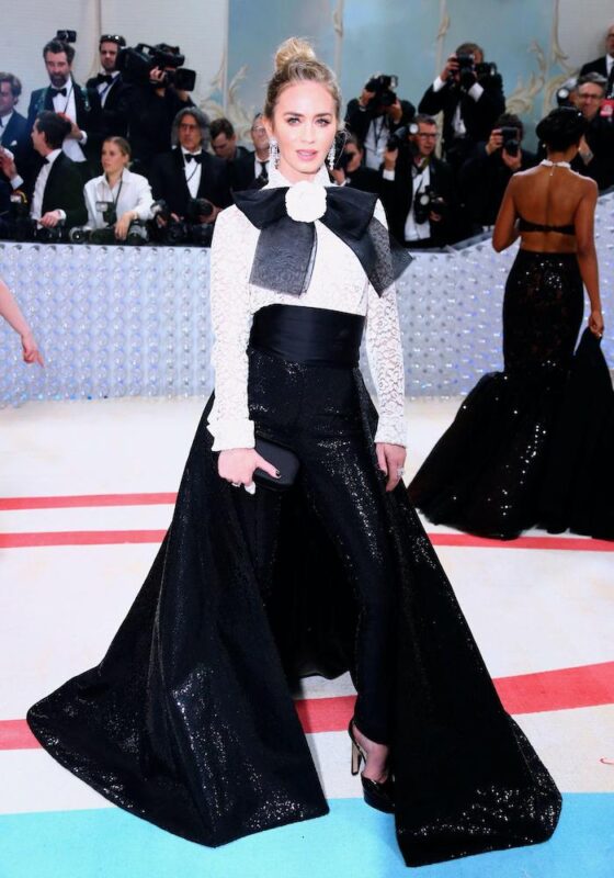 Michael Kors dressed Emily Blunt in an intricate white blouse and a glittering trouser/cape, tied up with a statement bow.
