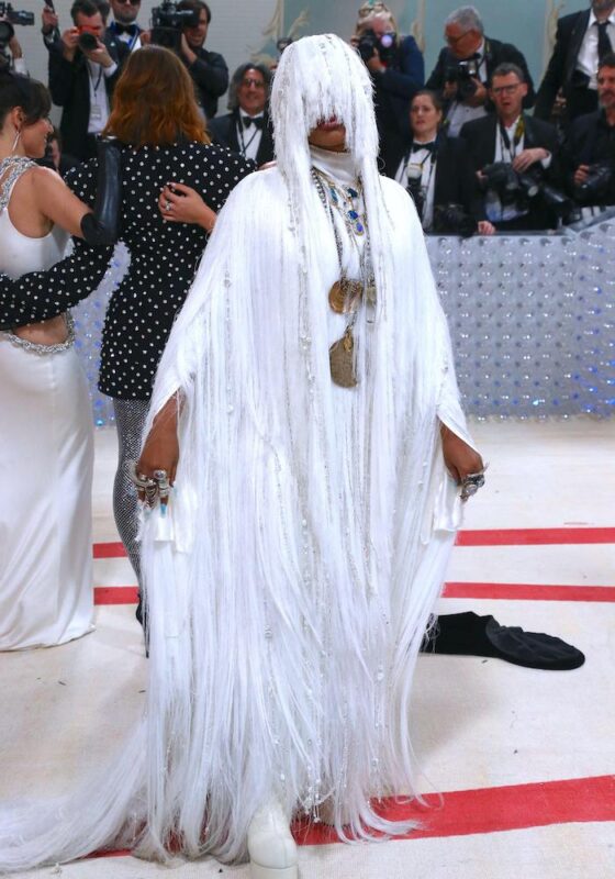 R&B icon Erykah Badu, who deejayed the night, wore a wig and gown reminiscent of Karl Lagerfeld’s white hair. Badu’s daughter, singer and model Puma Curry, wore a revealing look made of crystals and beads. Both were designed by alum Francesco Risso, creative director of Marni.