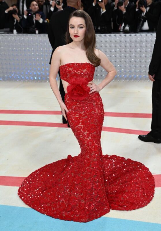 Actor Kaitlyn Dever wore a Kors-designed red lace gown that pooled at her feet.