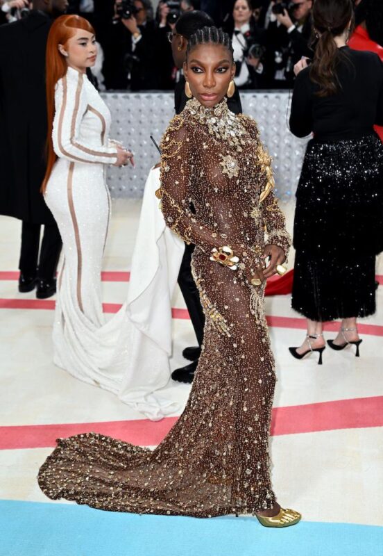 Gala co-chair Michaela Cole’s futuristic gold and silver dress by alum Daniel Roseberry, creative director of Schiaparelli, is replete with layered metals, pearls, and stones.